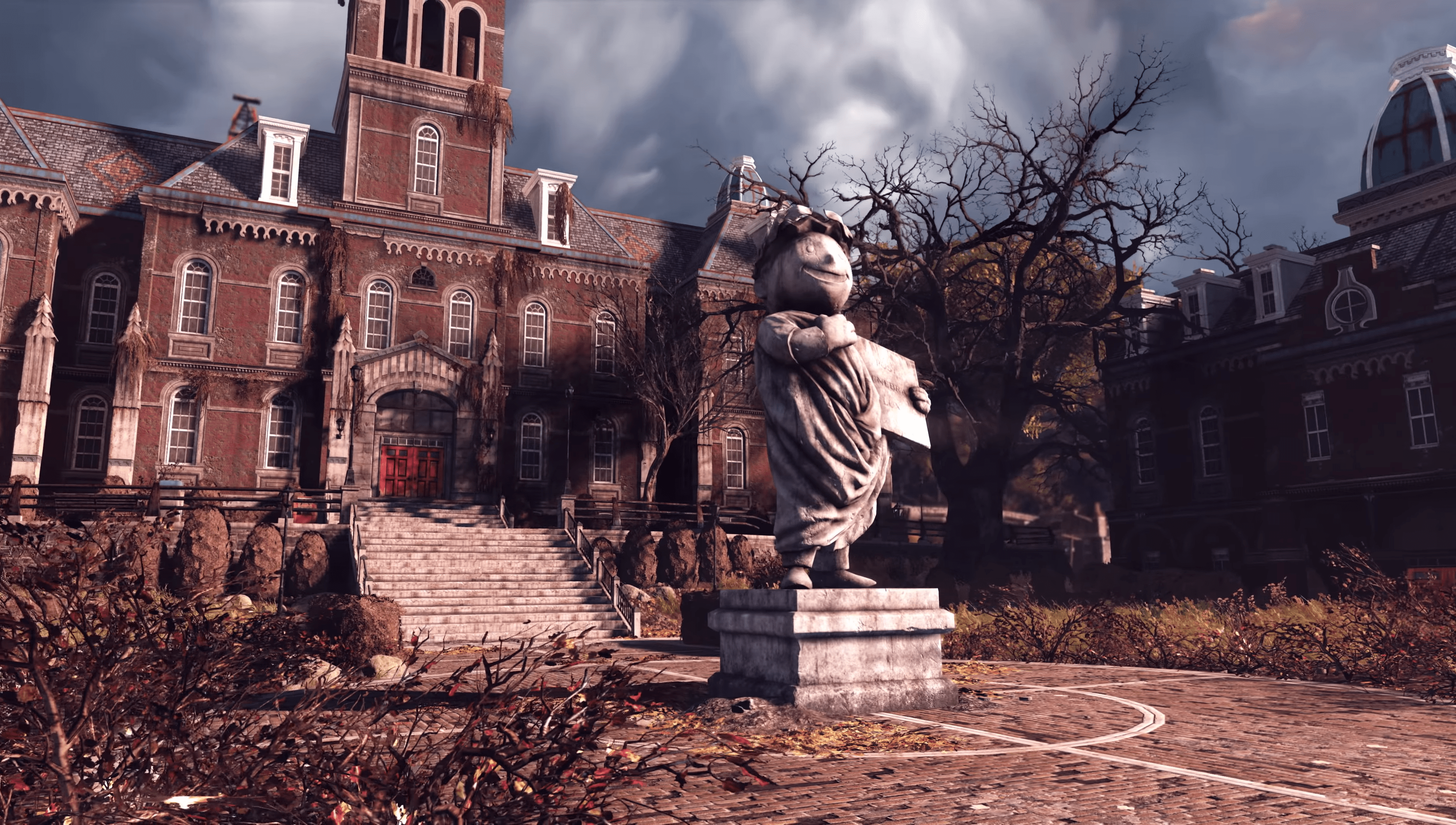 The head of the Vault Boy statue, seen in the center of the university campus, was stolen by the Pi Kappa Mu fraternity in August 2077.[8] It can still be seen in the basement of Pi House. The statue on the campus has its head intact.