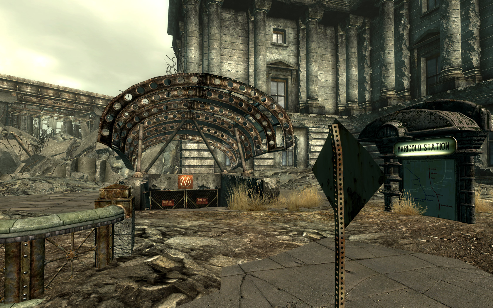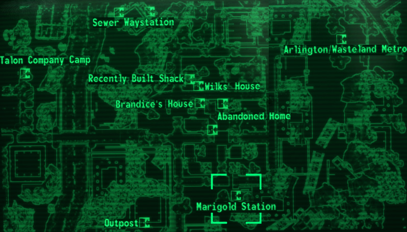 Outside the Marigold station is a building directly north of the location, an empty two-story building with several windows open for sniping. Besides the several fire ants, there is a random encounter with Talon Company mercs (Good Karma) or Regulators (Evil Karma), who spawn to the left of the station, down the stairs and beside the pillars of the partly destroyed building.