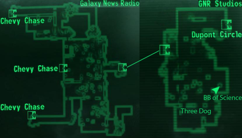 GNR大厦的大堂戒备森严,通道放满了沙袋和其他路障,还有数名装备了喷火器和激光步枪的兄弟会成员把守。左右的门都能通向外面的阳台以及浴室。有一些弹药箱和急救箱散落在大堂周围。