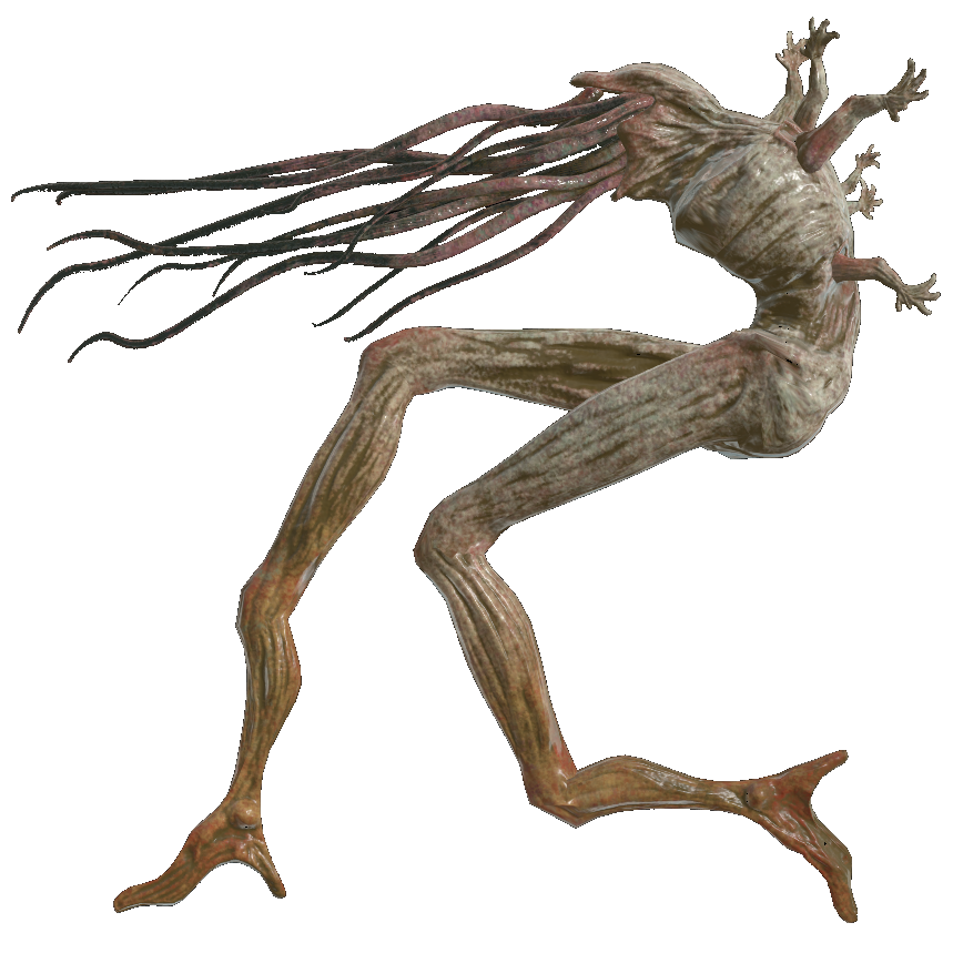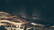 The Interloper is a large dormant creature found in the depths of the Lucky Hole Mine. It has several appendages protruding from its head and back. The creature will bleed if struck by the player character and its tentacles occasionally move. An audible hum is present heard near its body, which is surrounded by fog, skeletons, corpses, and effigies. In the ceiling of its lair, there are five art deco face sculptures arranged in a semicircle as if observing the Interloper.