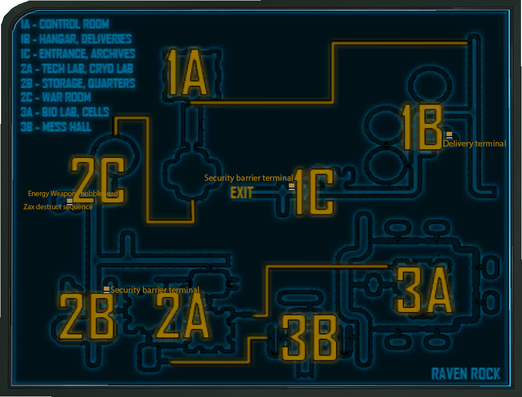 这条T字型的走廊在两端分别与冷冻实验室与科技实验室相连,走廊的地板之下设有许多激光感应的险境,以防止有人在从地板之下潜行。走廊的尽头堆放着许多空着的用于关押死亡爪的笼子,还有许多的储物箱。沿着走廊行走还可以看见两个空房间,其中一个房间里存放着被能量护盾保护着的武器装备, to disable the barrier the player character has to hack an Average locked terminal (requires a Science skill of 50)。 沿着走廊往基地第三层走,在末端左转的位置是秋上校的房间,房间里同样有着被能量护盾保护着的储物箱。秋上校的书桌上放着能量武器专精的摇头宝宝,他的床尾则是ZAX——也就是伊登总统的自毁密码。秋上校房间的对面是一道旋转楼梯,这条楼梯通向作战指挥室。指挥室正中有一副电子地图。该房间与伊登总统的控制室相连。