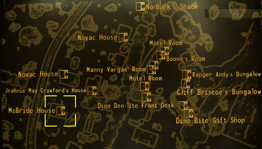 The McBride house consists of four rooms, including a kitchen, bathroom, bedroom, and living area. The couple has decorated the exterior of their home with brahmin skulls, including two flanking the front door and one on the mailbox. A corral with several brahmin is located next to their home to the south.