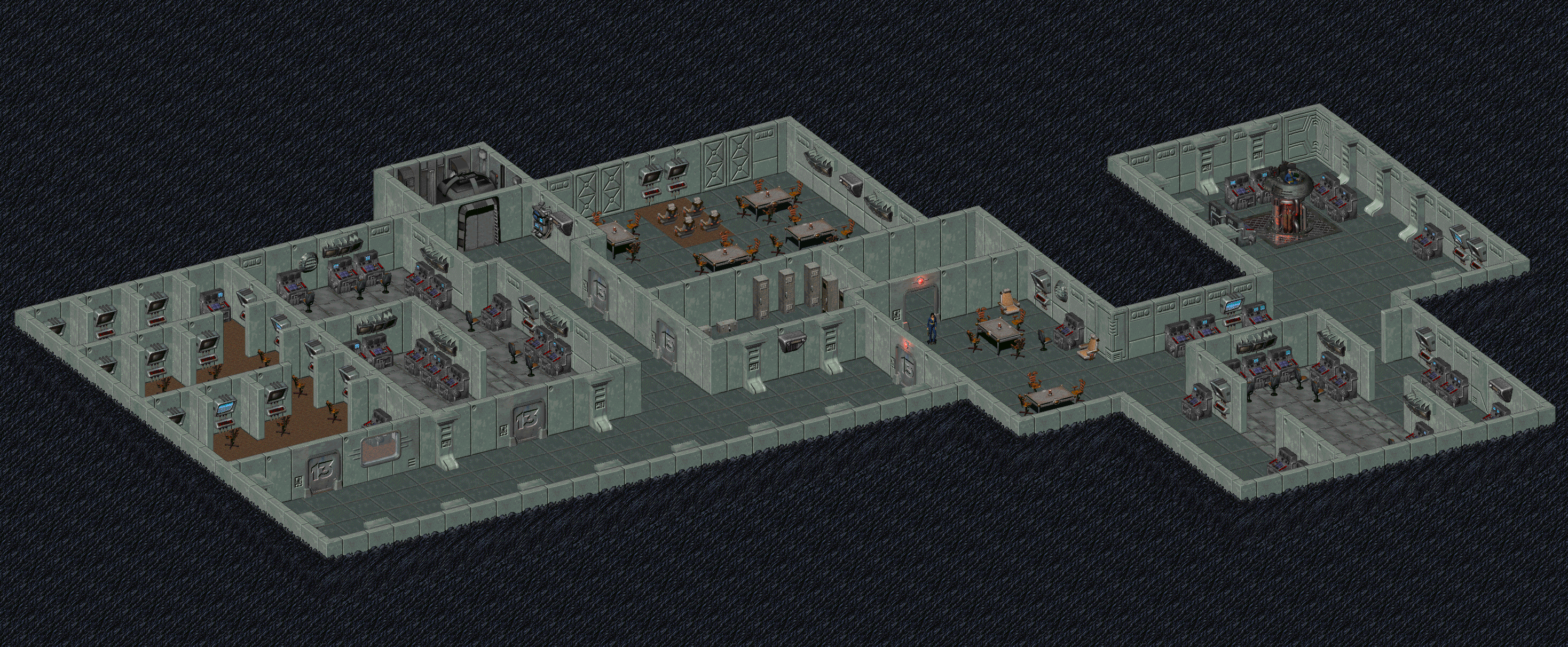 监督者所在的指挥中心,以及避难所图书馆。这是监督者维护避难所的地方。附近是图书馆、军械库和供水室。但是,需要净水守卫分派补给,因为有一个偷水的贼人。可以在最西端的计算机上使用科学技能“花一些时间研究重要信息”。