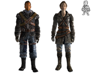 A bulky black and dark blue leather jacket tucked into black gloves with blue jeans and black knee-high boots. On the male version, there are two bandoleers strapped diagonally around the torso. The female version does away with the belted ammunition and instead has leather cartridge carrying belts around the waist. Can be found on many slavers in Paradise Falls (namely Grouse) or in the Lincoln Memorial (Silas and many other slavers) but it can be found on other people such as Evan King. Bannon at Potomac Attire sells one. They will also randomly spawn in lockers and footlockers.