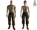 The outfit consists of a dirty white T-shirt (white tank top for female) and brown cargo pants, tucked into shin-high army boots. It can be found on several non-player characters, including Sid and Argyle, and all wasteland captives held by super mutants. They will also randomly spawn in lockers and footlockers. The female version also has a small splash of blood on the left thigh.