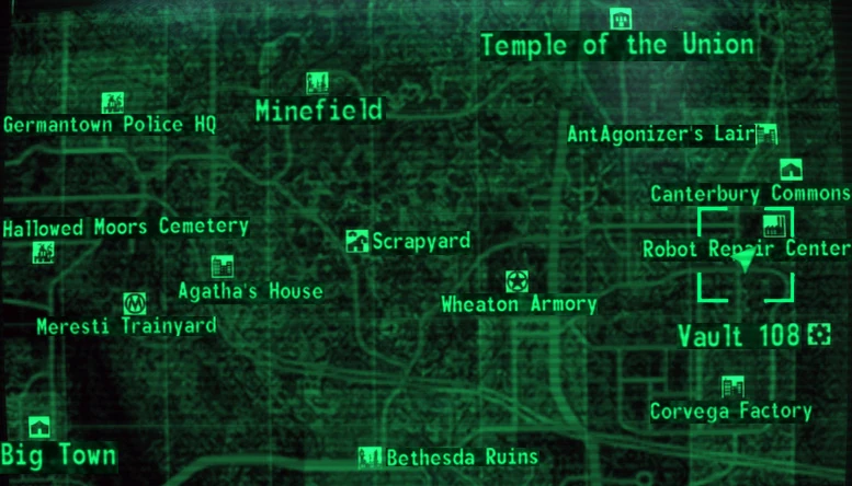 | | Abandoned camp · Abandoned tent · Francis Scott Key Bridge · Calverton · Camp RHO · Car dealership · Concrete treehouse · Cratered hamlet · Drainage chamber · Exploding scientist truck · Festive raider camp · Bannister crater · Freeway raider encampment · Ghoul outpost · Hilltop farm ruins · Hollowed-out rock · Internment truck · Irradiated outhouse · Lucky's · Military checkpoints · Minefield power substation · Monorail train wreckage · Musty caverns · Overlook raider shack · Patriotic picnic area · Pirate Pely · Potomac River · Pylon shack · Raider canal · Raid shack · Raider farmhouse · Raider shop · Raider wreckage fortifications · Riverside raider shacks · Rockopolis · Scavenger's bridge (Mole rat race track) · Scavenger's jetty · Scavenger shack · Shelter · Super mutant bonfire · Talon Company camp · Wasteland gypsy village · Wastelander lake hideout · Wastelander campsite · Willy's grocer |