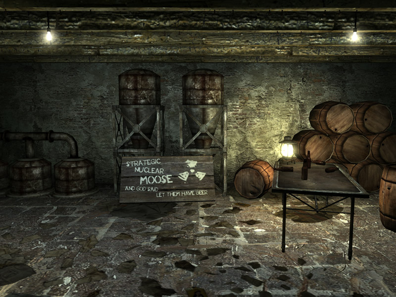Brewer's beer bootlegging is a bootleggers' shack. The man who lived here, Gourd, planned to market his own alcoholic beverage called Strategic Nuclear Moose. Unfortunately, the cazadores outside killed him before he could get the business off the ground. With a Lockpick skill of 50, one can open the cellar door and find Gourd's secret brewery down the stairs. There is a key to this door in the main room to the left of the locked door, on top of the bookshelf with a Sunset Sarsaparilla star bottle cap.